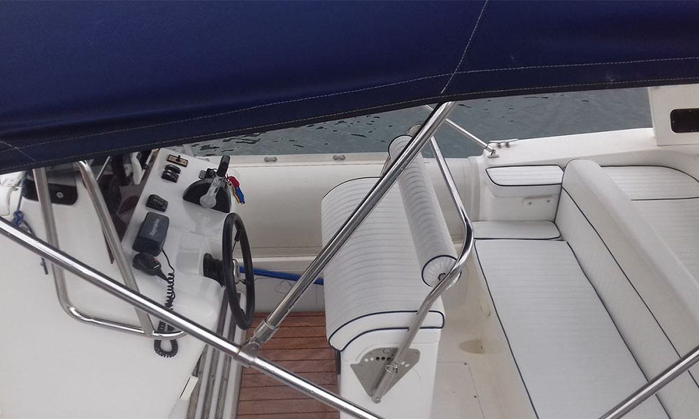 The Sky Fall is a nice fast fun boat, it is a Rigid Inflatable (RIB) with an 350 Hp 4-stroke Yamaha engine. The light structure makes this boat more economical even when racing. It comes with electric start, steering wheel, swimming ladder, navigation lights and all the safety equipment you may need. Moreover, like all our boats, this rental is checked by the local authorities every year before the season starts and is also checked regularly during the summer months.